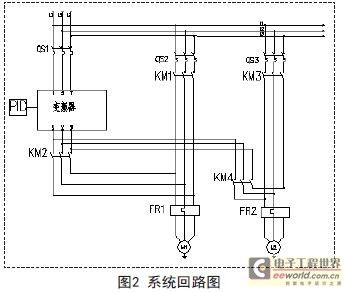 系統采用手動和自動兩種控制方式,PLC首先使主水泵變頻啟動,壓力傳感器將母管壓力反饋給PLC,與預先設定的給定壓力比較,通過PID運算,調節變頻器的輸出頻率,以維持水壓恒定。若用水量大到1臺水泵全速運行也不能達到給定壓力時,PLC將該水泵由變頻運行投入到工頻運行,同時將另一臺水泵投入到變頻運行,增加管網供水量以保證壓力穩定。當用水量減少時,PLC首先將工頻運行的泵停掉,減少供水量,整個系統保證變頻運行時只有1臺泵變頻恒壓供水。系統采用變頻泵循環方式,以“先開先關”順序關泵,既保證了系統有備用泵,又有效的防止備用泵長期不用出現“繡死”現象。系統主電路圖如圖2所示。