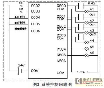 控制電路如下圖3所示,SB1控制系統的啟動,SB2控制系統的停止,當水泵出現過載時,A5燈亮。當變頻器出現故障時,A6燈亮。A1、A2分別為泵1的變頻、工頻運行指示燈,A3、A4分別為泵2的變頻、工頻運行指示燈。