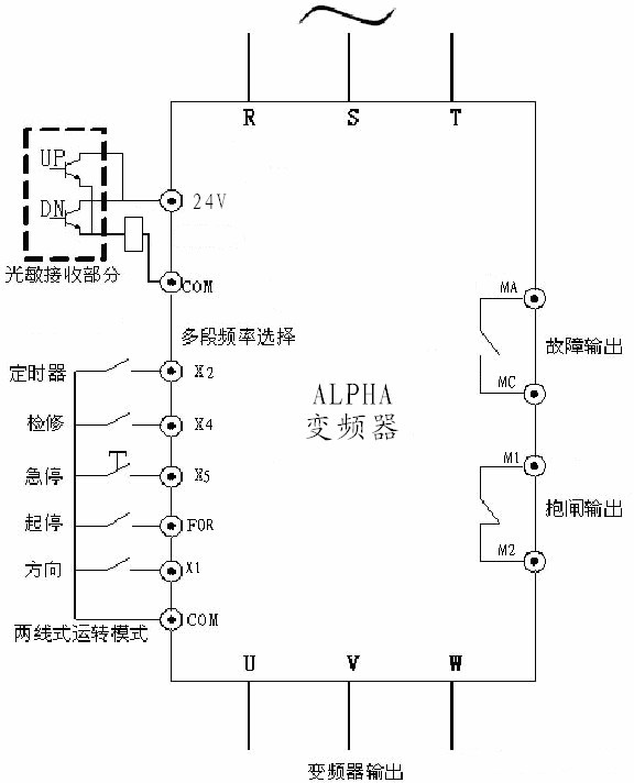 用兩臺ALPHA3300 通用型變頻器控制自動扶梯的電機,載客運行時變頻器設置為外端子控制,速度控制設置為多段方式,即設置正常運行頻率(50Hz)﹑減速運行頻率(15Hz)。檢修(爬行)時,運行頻率較低,大約在25Hz 左右。
