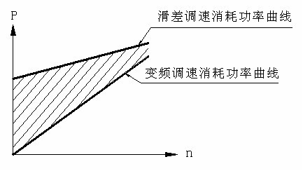 將22KW的滑差調速電機的滑差頭鉆孔裝配螺絲,使電機軸與負載軸作硬性連接,如滑差電機快到使用壽命可更換成普通的籠形電機,改造后的電機通過變頻器來啟動和調度。盤塔式卸料裝置屬典型的恒轉矩負載,用變頻調速代替原來的滑差調速系統效率大大提高,下圖為兩種交流調速系統拖動恒轉矩負載所需的功率隨轉速變化的曲線,圖中斜線部分為兩系統所需功率之差,由下圖可知負載轉速越低,變頻系統節能效果越顯著。