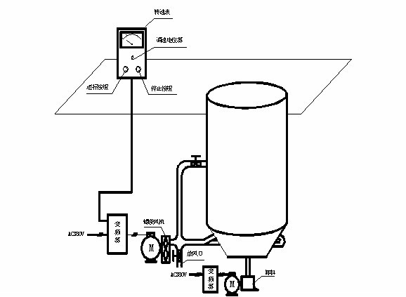 (2) 為方便窯面操作人員控制風量,將變頻器設置為端子控制,控制 信號引至窯面,在窯面裝一操作面板,通過操作面板便可控制風機的啟停、調節供風量,操作人員根據煅燒工況,可隨意調節風量大小。操作面板上安裝有一轉速表,可指示風機電機轉速。