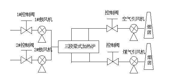 中寬帶作業區采用三段梁式加熱爐,送風量靠進風閥調節,鼓風機設計為一用一備,24小時運行。在正常生產加熱冷鋼壞時,鼓風機進風閥開度為70~80%,送風壓力保持在4.5kPa左右,確保爐膛加熱溫度。在加熱熱鋼壞時鼓風機進風閥開度為50~60%,送風壓力保持在4.5kPa左右,在加熱爐保溫時送風量需求更少,進風閥開度再相應減小,送風壓力保持在4.2kPa左右。,煤氣排煙和空氣排煙風量靠進風閥調節。在正常生產加熱冷鋼壞時,煤氣排煙風機空氣排煙進風閥開度為70~85%,在正常生產加熱熱鋼壞時,煤氣排煙風機空氣排煙風機進風閥開度為50~60%,在加熱爐保溫時,則兩臺風機進風閥開度則為30%。空氣排煙風機煤氣排煙風機進風閥開度根據軋鋼速度軋鋼大小做調整保證爐膛內溫度的均恒,兩者的排煙溫度控制在100℃以內,超180℃報警,加熱爐風機工藝簡圖如下: