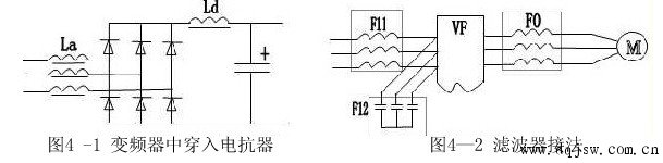 在變頻器的輸入輸出側電路中,除上述較低次的諧波成份外,還有許多頻率較高的諧波電流,它們將以各種方式形成對其他設備的干擾信號,濾波器就是用于削弱頻率較高的諧波分量的方法(如圖4-2所示)。